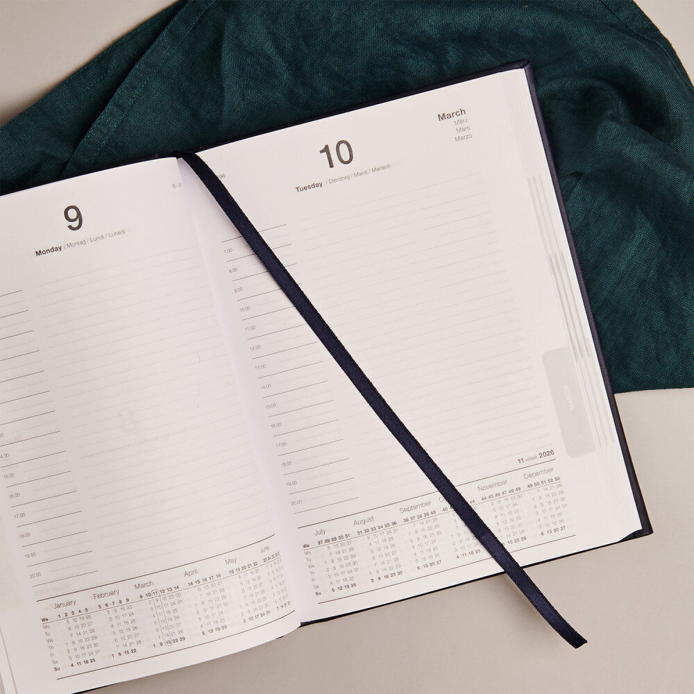 În interior, calendarul prezintă un format de 1 zi pe 1 pagină (weekend pe 1 pagină), o secțiune cuprinzătoare de informații, o agendă telefonică și de adrese, un atlas cu hărți și o panglică pentru marcarea paginilor.