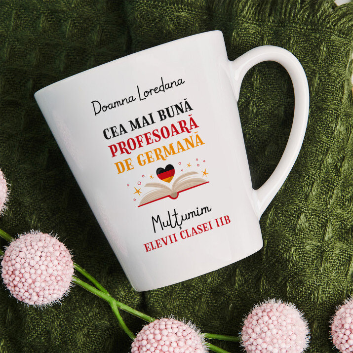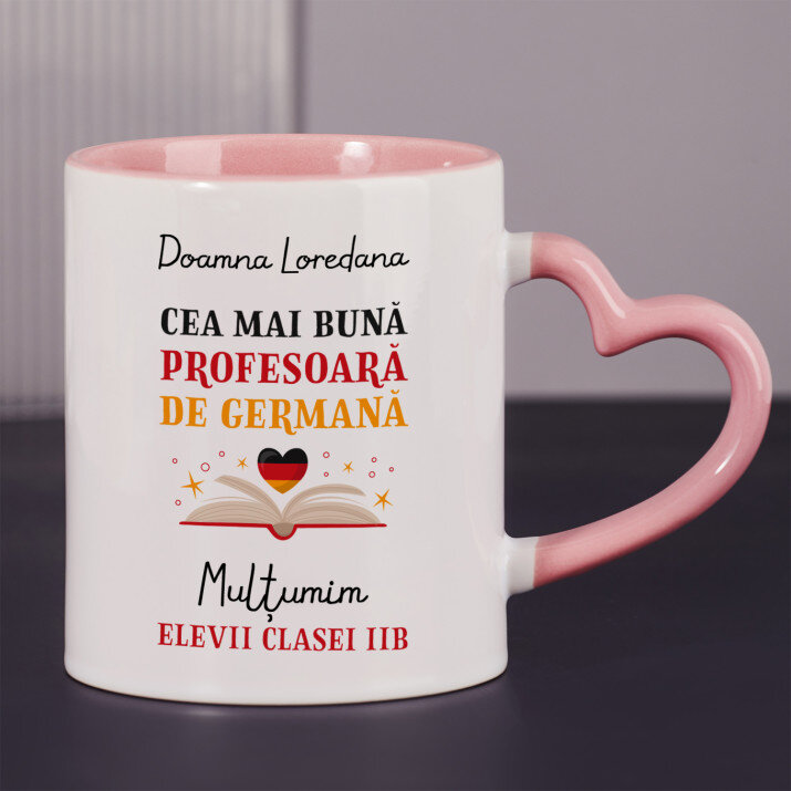 Sunt disponibile și căni cu un mâner în formă de inimă și un interior roz, capacitate de 330 ml