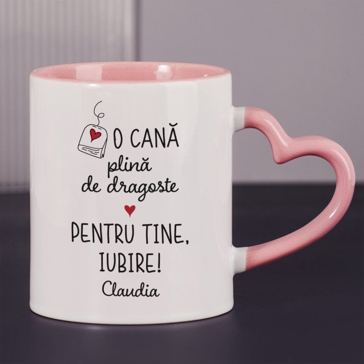 Sunt disponibile și căni cu un mâner în formă de inimă și un interior roz, capacitate de 330 ml