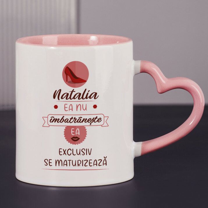 Sunt disponibile și căni cu un mâner în formă de inimă și un interior roz, capacitate de 330 ml