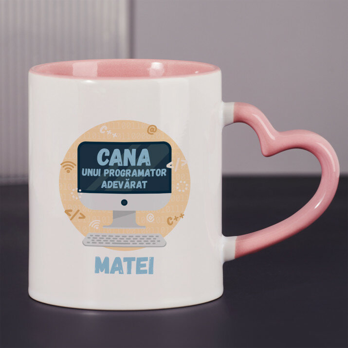 Sunt disponibile și căni cu un mâner în formă de inimă și un interior roz, capacitate de 330 ml