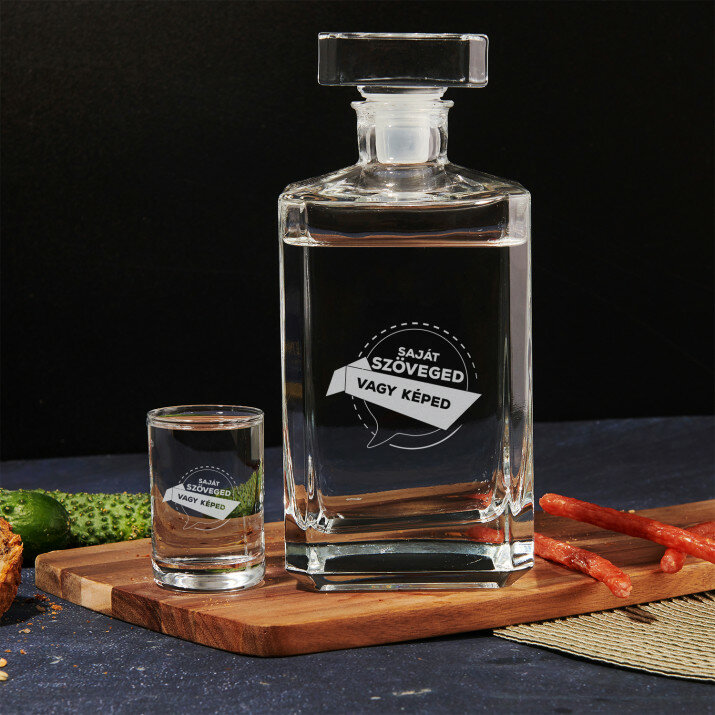 Set cu carafă gravată și 6 păhărele pentru vodcă.Carafa a fost fabricată din sticlă transparentă de înaltă calitate. Cu forma sa simplă și aspectul stilizat, produsul va arăta elegant în fiecare bar. Forma pătrată refractă lumina, ceea ce scoate în evidență foarte bine culoarea băuturii.Carafa are o capacitate de 700 ml, o înălțime de 19,5 cm și o lățime de 8,5 cm..
