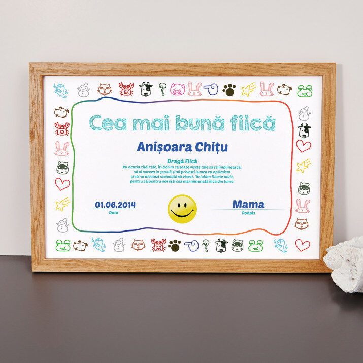 Certificatul este imprimat pe hârtie fotografică de 20x30 cm și încadrat într-o ramă elegantă de 20x30 cm.