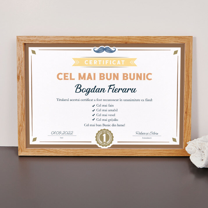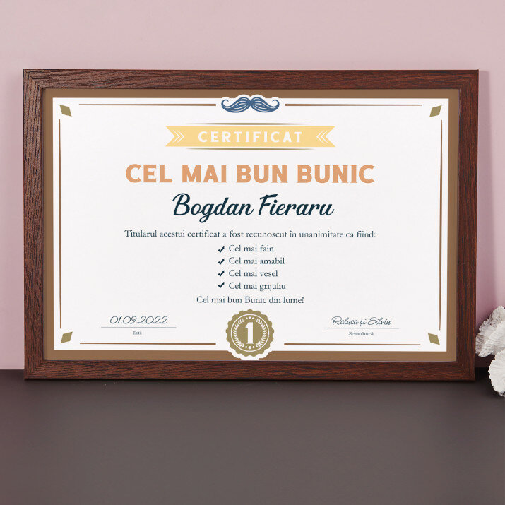Certificatul este imprimat pe hârtie fotografică de 20x30 cm și încadrat într-o ramă elegantă de 20x30 cm.