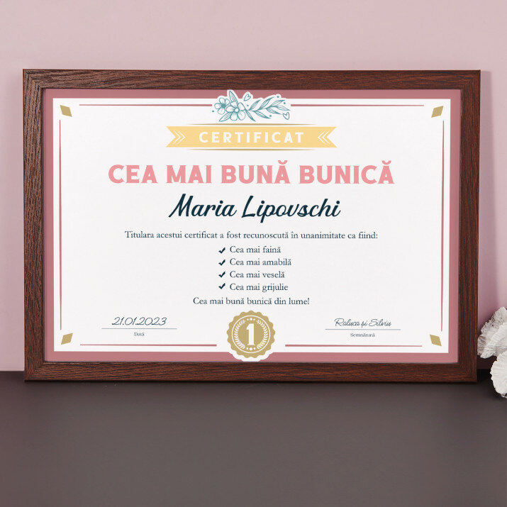 Certificatul este imprimat pe hârtie fotografică de 20x30 cm și încadrat într-o ramă elegantă de 20x30 cm.