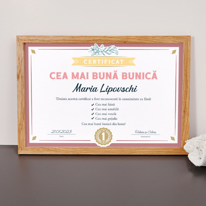 Certificatul 'Cea Mai Bună Mamă' este o idee minunată pentru un cadou. Textul este emoționant, iar posibilitatea de personalizare îi adaugă și mai multă valoare.