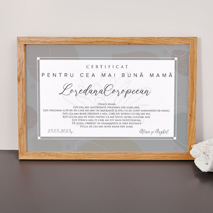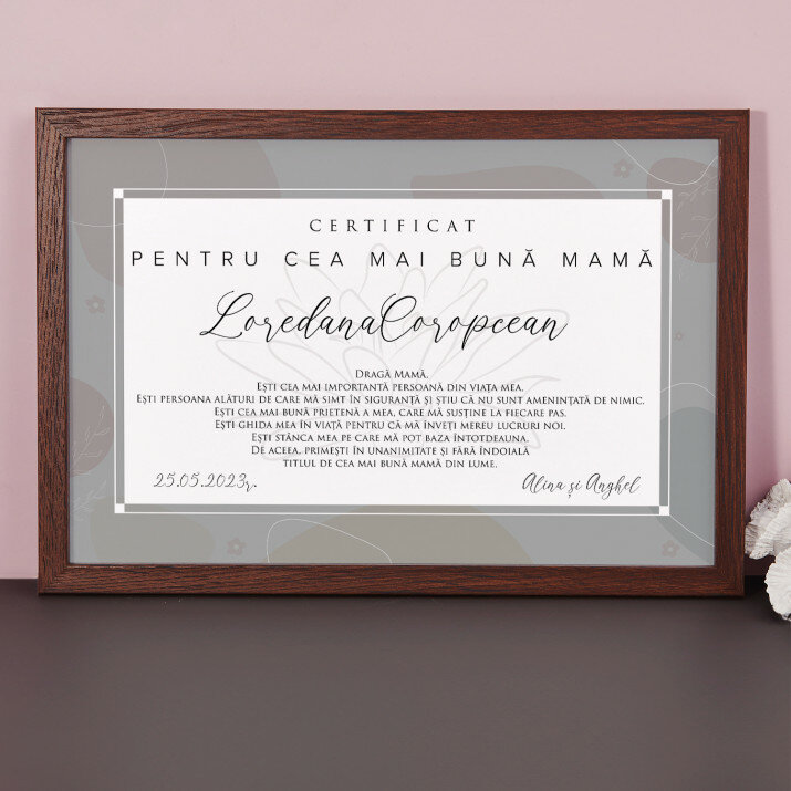 Acest certificat este cadoul ideal pentru mama mea. Textul este emoționant, iar personalizarea cu numele ei l-a făcut cu adevărat special.