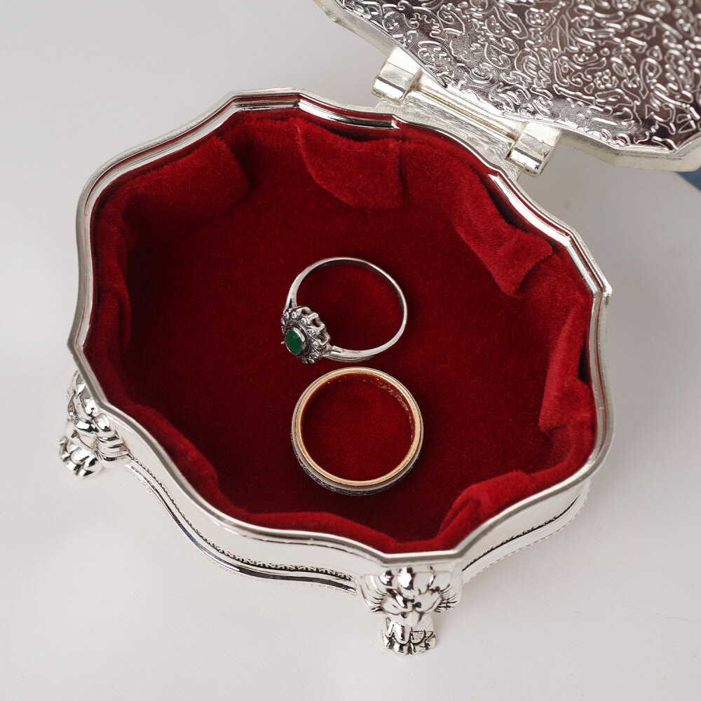 Cutiuță frumos decorată placată cu argint pentru bijuterii.