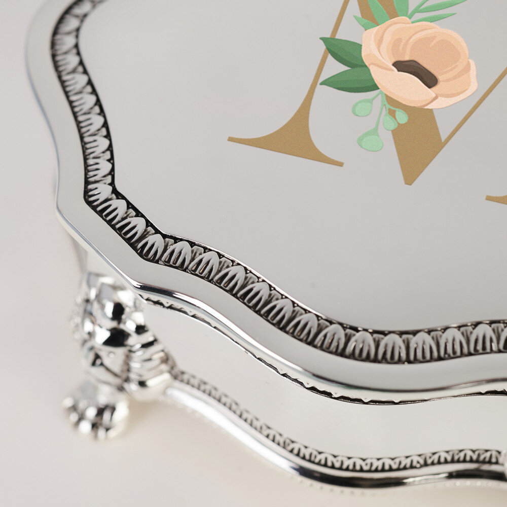 Cutia de bijuterii argintie cu nume este o modalitate frumoasă de a păstra amintiri prețioase. Este solidă și elegantă.