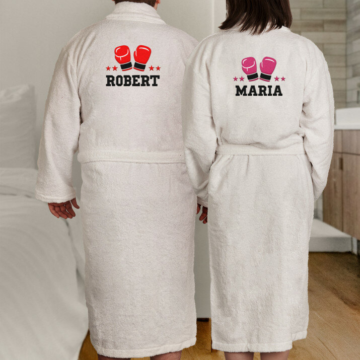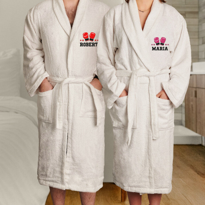 Două halate universale de culoare albă, confecționate din 100% bumbac . Confortabil, frumos și delicat la atingere - va oferi un confort perfect atunci când toate grijile zilei au dispărut și este timpul să vă relaxați. De asemenea, vă va încălzi corpul somnuros imediat ce v-ați trezit. Halaturile sunt decorate cu broderie personalizată , care arată frumos, îmbunătățește starea de spirit și transformă produsul într-un cadou special!Fiecare halat are o croială elegantă, cu guler și buzunare, astfel încât vei străluci la defilarea de seară prin casă. Mărimea halatului este universală, greutate 350 g/m2. Unisex.