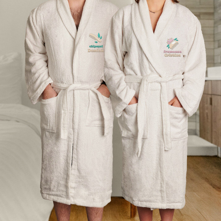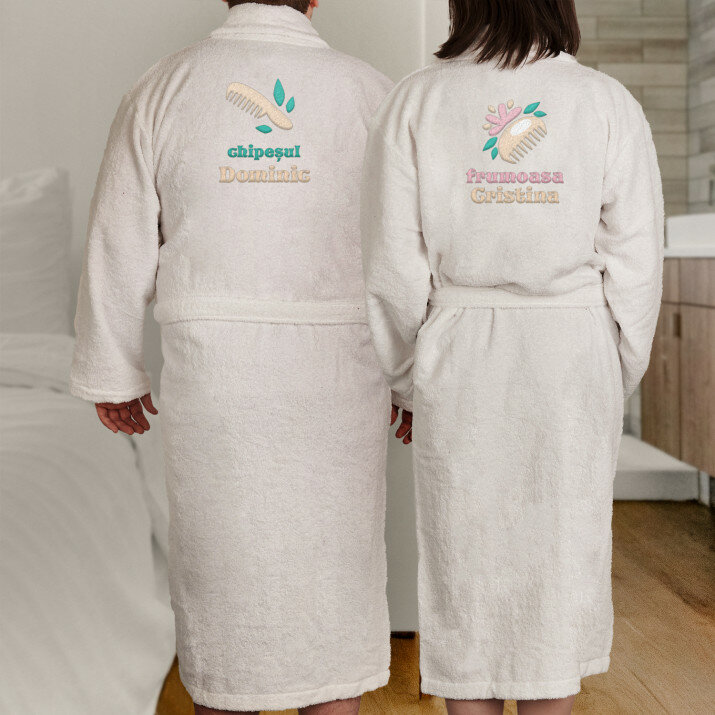 Două halate universale de culoare albă, confecționate din 100% bumbac . Confortabil, frumos și delicat la atingere - va oferi un confort perfect atunci când toate grijile zilei au dispărut și este timpul să vă relaxați. De asemenea, vă va încălzi corpul somnuros imediat ce v-ați trezit. Halaturile sunt decorate cu broderie personalizată , care arată frumos, îmbunătățește starea de spirit și transformă produsul într-un cadou special!Fiecare halat are o croială elegantă, cu guler și buzunare, astfel încât vei străluci la defilarea de seară prin casă. Mărimea halatului este universală, greutate 350 g/m2. Unisex.