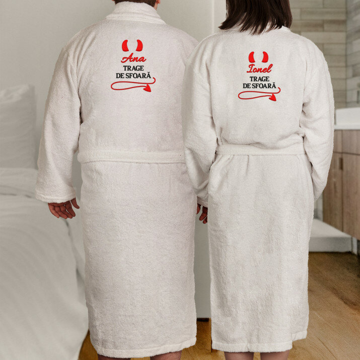 Două halate universale de culoare albă, confecționate din 100% bumbac . Confortabil, frumos și delicat la atingere - va oferi un confort perfect atunci când toate grijile zilei au dispărut și este timpul să vă relaxați. De asemenea, vă va încălzi corpul somnuros imediat ce v-ați trezit. Halaturile sunt decorate cu broderie personalizată , care arată frumos, îmbunătățește starea de spirit și transformă produsul într-un cadou special!Fiecare halat are o croială elegantă, cu guler și buzunare, astfel încât vei străluci la defilarea de seară prin casă. Mărimea halatului este universală, greutate 350 g/m2. Unisex.