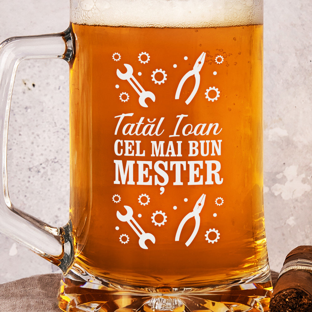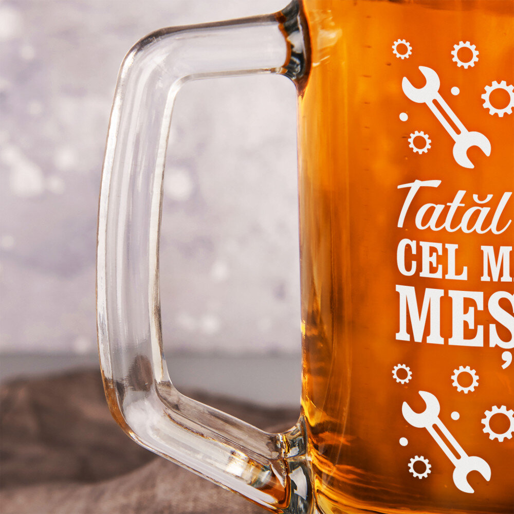 Halba de bere realizată din sticlă de înaltă calitate este extrem de durabilă și rezistentă la opacizare și zgâriere. Dispune de un mâner confortabil pentru confort și siguranță în timpul utilizării. O gravură personalizată va fi plasată pe suprafața perfect netedă. Halba de bere este un cadou excelent pentru un iubitor al băuturii aurii. Reprezintă un cadou excelent pentru multe ocazii!