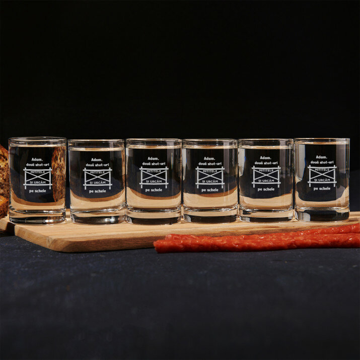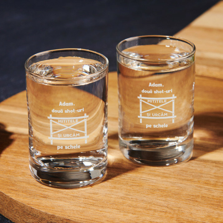 Pahare elegante, fabricate din sticlă transparentă de înaltă calitate. Cu forma sa simplă, clasică și proporțiile perfect echilibrate, paharele vor fi pe placul tuturor și vor fi ideale pentru orice tip de petreceri. Am plasat o gravură personalizată pe suprafața netedă a produsului pentru a face toasturile și mai plăcute! Paharele sunt disponibile atât separat, cât și în seturi de 2, 4 sau 6 bucăți. Pot fi spălate în mașina de spălat vase.Capacitatea: 50 ml