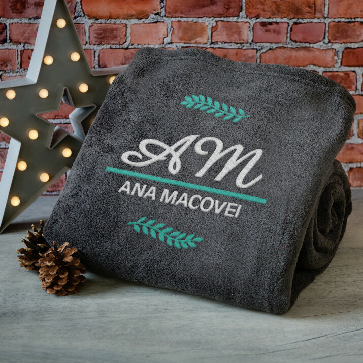 Pătură cu dimensiunile 140 x 200 cm de culoare gri, confecționat din fleece de înaltă calitate, are o pufozitate și o moliciune unică, decorat cu unul dintre modelele noastre personalizate, brodate.