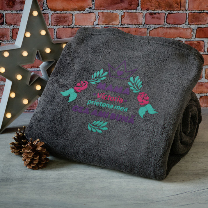 Pătură cu dimensiunile 140 x 200 cm de culoare gri, confecționat din fleece de înaltă calitate, are o pufozitate și o moliciune unică, decorat cu unul dintre modelele noastre personalizate, brodate.