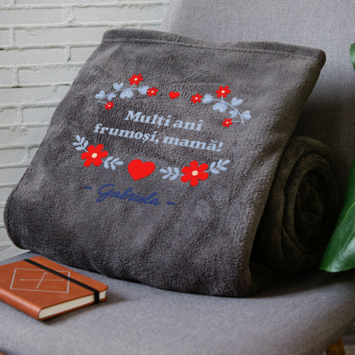 Pătură cu dimensiunile 140 x 200 cm de culoare gri, confecționat din fleece de înaltă calitate, are o pufozitate și o moliciune unică, decorat cu unul dintre modelele noastre personalizate, brodate.
