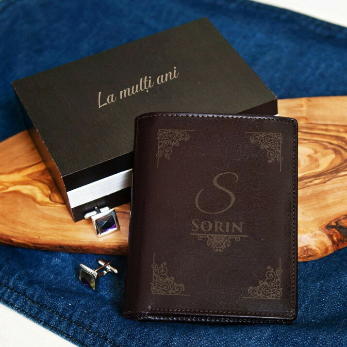 Acest portofel elegant pentru bărbați maro din piele naturală este cadoul perfect pentru un domn elegant! Practic și confortabil de utilizat, acesta va conține bani, carduri și toate documentele. Are un compartiment pentru monede, 2 buzunare pentru bancnote, 6 compartimente pentru cărți de credit, 5 buzunare pentru documente. În plus, este dotat cu o folie care protejează împotriva furtului de date de pe cardurile de proximitate (blocarea semnalului RFID). Portofelul este ambalat într-o cutie de lemn, pe care se poate plasa și o gravură.Dimensiunile portofelului: 96 x 122 x 20 mm.