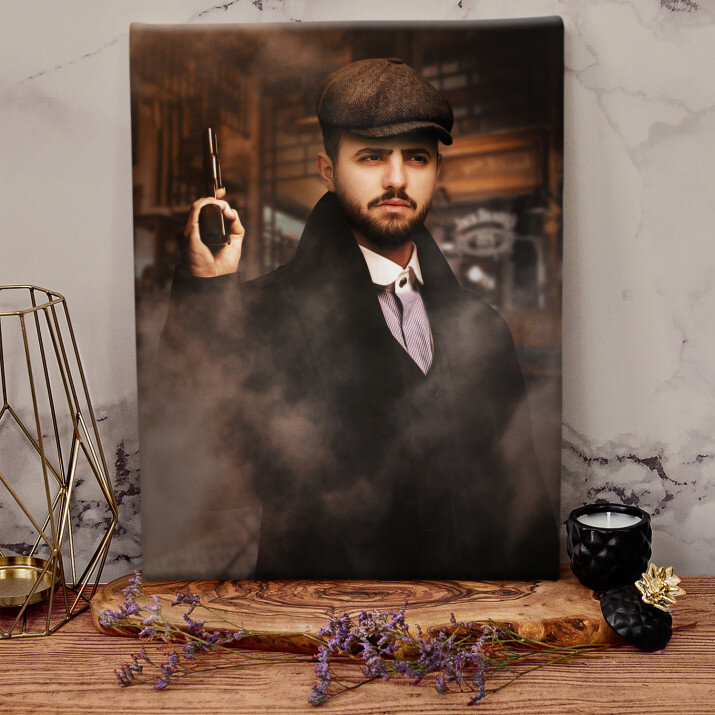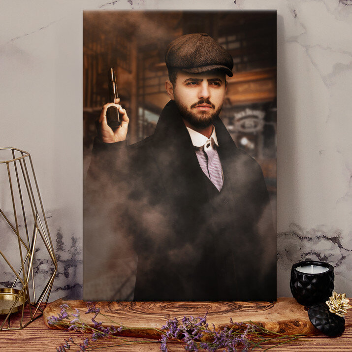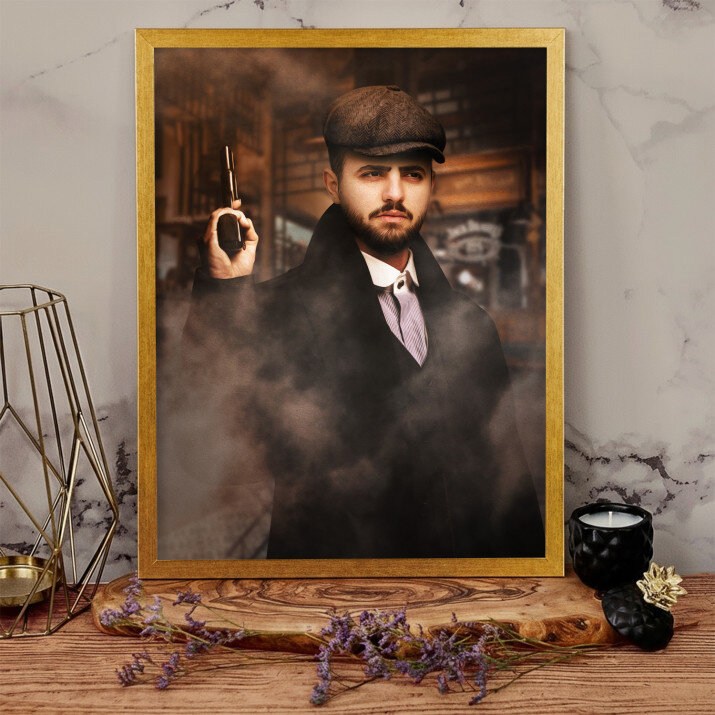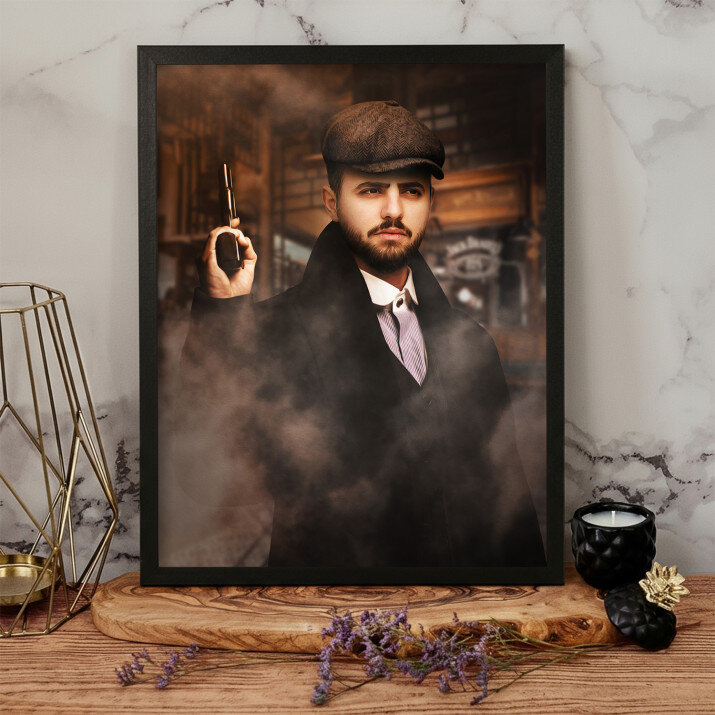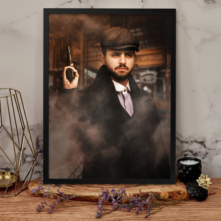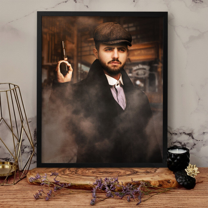 Portretul viselor Peaky Blinders într-o ramă neagră este o decorațiune deosebită pentru fanii serialului. Oferă caracter fiecărui spațiu.