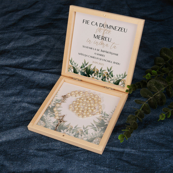 O amintire frumoasă pentru o viață întreagă! Oferiți cadou rozariul nostru ambalat estetic și subliniați caracterul festiv al evenimentelor religioase. Culoarea perlată a mărgelelor și detaliile de pe elementele metalice se potrivesc cu atmosfera solemnă a zilei. În cutia de cadou din lemn este lipită o felicitare personalizată cu un design la alegerea Ta, iar rozariul este ambalat în interior. Acest lucru va face cadoul și mai special, iar zâmbetul de pe fața destinatarului și mai mare!