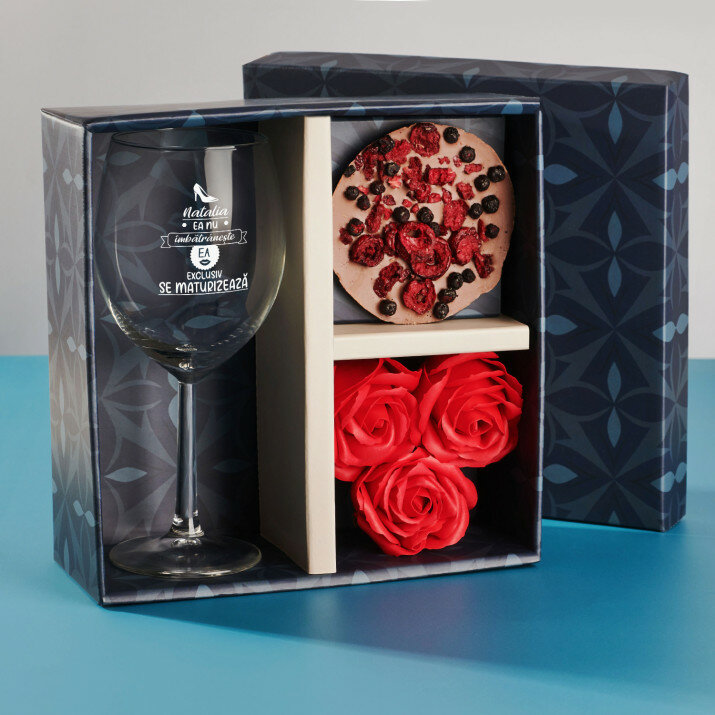 COMPOZIȚIA SETULUI 1. Paharul pentru vin - prezentându-se extrem de estetic, adaugă o notă specială oricărei degustări. Poți adăuga o inscripție personalizată pentru a face cadoul mai special.2. Trandafiri din săpun transformă un moment de relaxare într-unul extraordinar de fermecător.