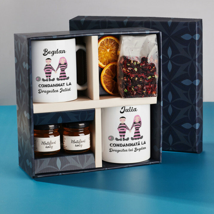 COMPOZIȚIA SETULUI 1. Două căni personalizate, la care puteți adăuga o dedicație din inimă, la alegere, dându-le o notă extrem de personală. Fiecare cafea de dimineață sau ceai de seară va căpăta o semnificație specială.2. Ceaiul de fructe, atent ales cu gândul la cei mai pretențioși pofticioși, garantează un adevărat răsfăț al simțurilor. Un buchet aromatic, deosebit și gustul subtil, permite descoperirea unor noi arome și gusturi. În set sunt incluse și două portocale uscate .