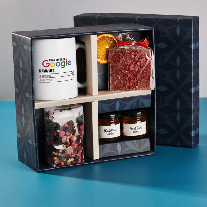 1. Cană personalizată care devine un accent deosebit pentru momentele de zi cu zi. Datorită opțiunii de personalizare, acesta devine un cadou deosebit, iar semnătura ta îi conferă o notă extrem de personală.2. Ceaiul de fructe, selectat cu grijă pentru cei mai pretențioși gurmanzi, garantează o adevărată sărbătoare al gusturilor. Notele subtile ale gustului și aroma unică a buchetului îți permit să descoperi noi arome și gusturi. În set sunt incluse și două portocale uscate.