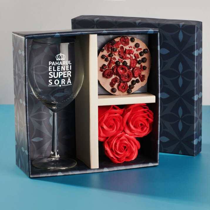 COMPOZIȚIA SETULUI 1. Paharul pentru vin - prezentându-se extrem de estetic, adaugă o notă specială oricărei degustări. Poți adăuga o inscripție personalizată pentru a face cadoul mai special.
