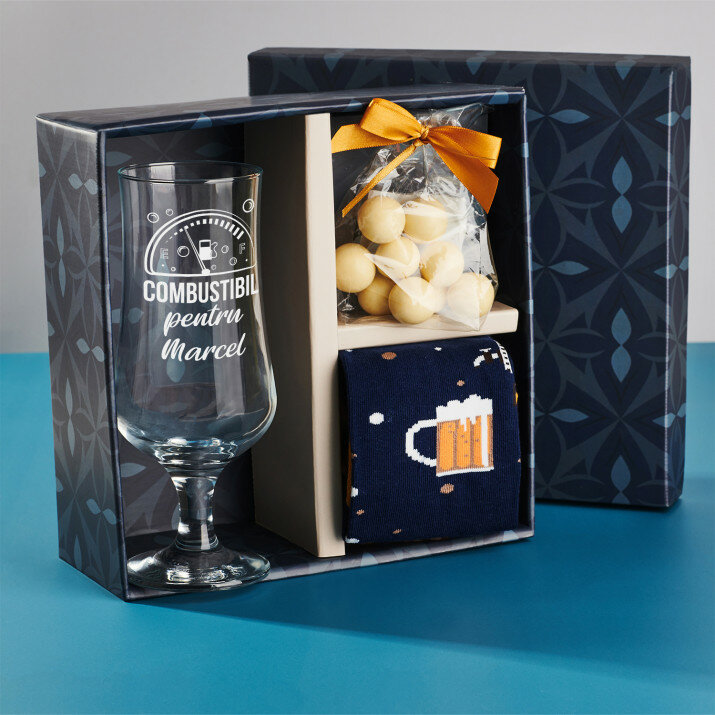 CONȚINUTUL SETULUI 1. Un pocal deosebit pentru bere, care evidențiază ritualul de degustare a băuturii preferate. Datorită posibilității de a adăuga o personalizare deosebită pe pocal, acesta devine extrem de personal! Creat pentru amatorii gustului rafinat al berii .