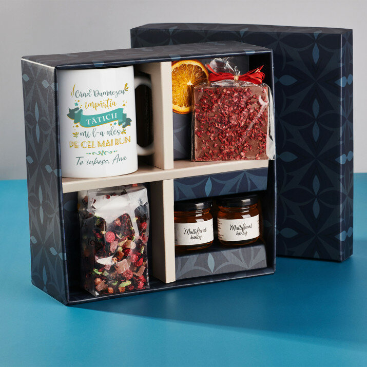 1. Cană personalizată care devine un accent deosebit pentru momentele de zi cu zi. Datorită opțiunii de personalizare, acesta devine un cadou deosebit, iar semnătura ta îi conferă o notă extrem de personală.2. Ceaiul de fructe, selectat cu grijă pentru cei mai pretențioși gurmanzi, garantează o adevărată sărbătoare al gusturilor. Notele subtile ale gustului și aroma unică a buchetului îți permit să descoperi noi arome și gusturi. În set sunt incluse și două portocale uscate.