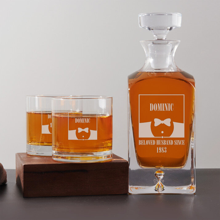 Setul cu un decantor și pahare gravate este un cadou perfect pentru iubitorii de whisky. Eleganță și stil.
