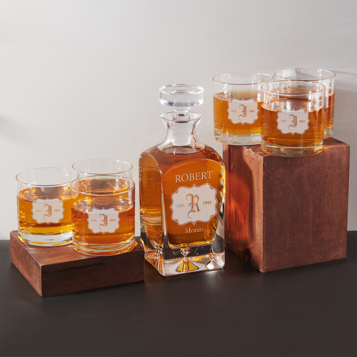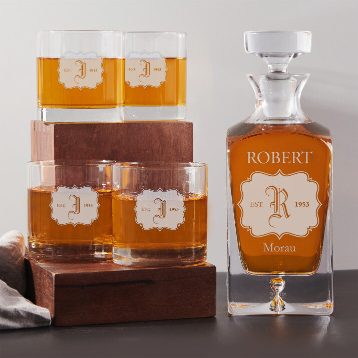 Setul cu un decantor și pahare gravate este un cadou perfect pentru iubitorii de whisky. Eleganță și stil.