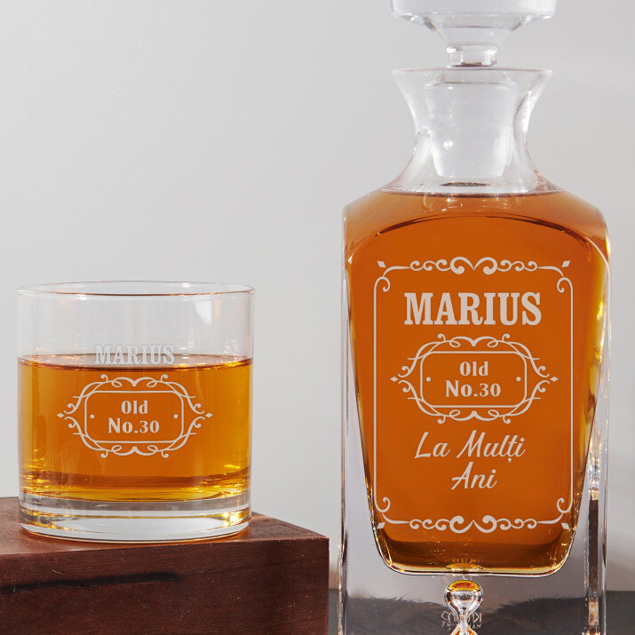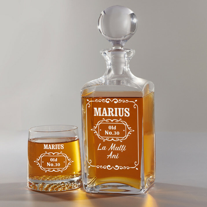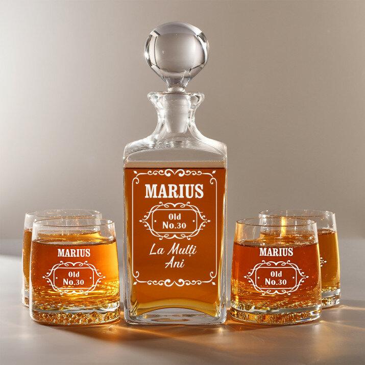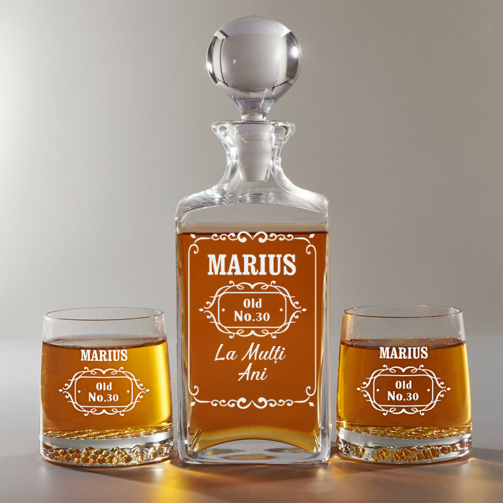 Carafa și paharele gravate sunt un cadou fantastic pentru iubitorii de whisky. Setul arată minunat pe masă.