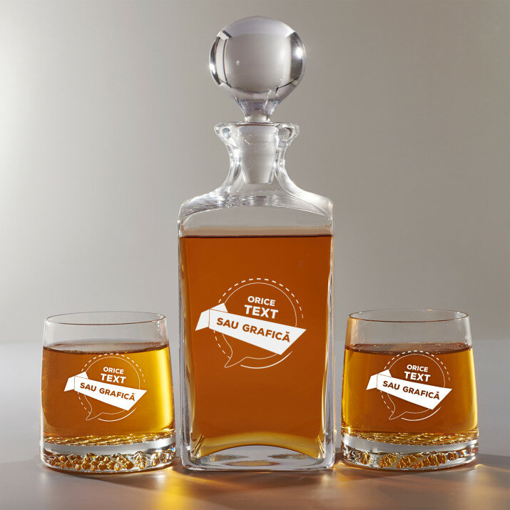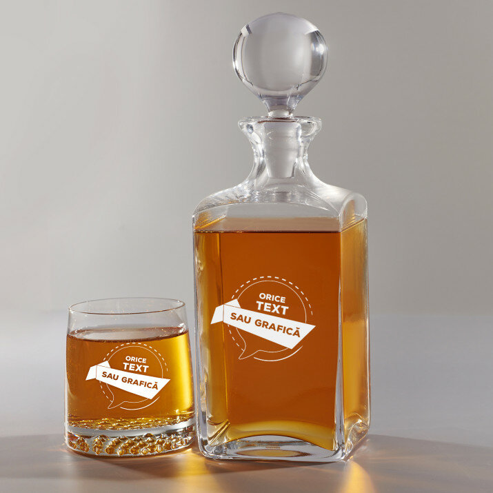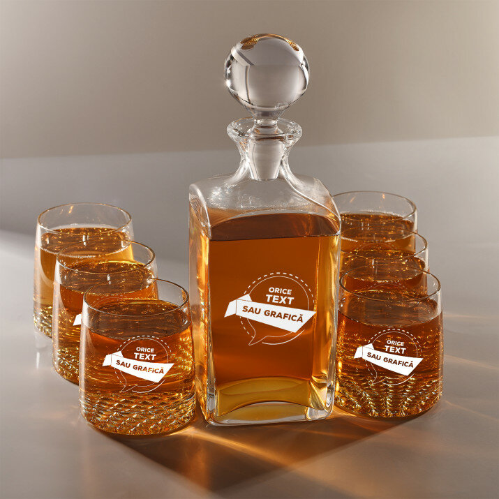 Set cu carafă și pahare pentru whisky, cu gravură. Disponibil în patru variante :Carafă + 1 pahar