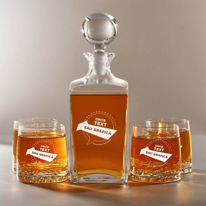 Setul cu un decantor și pahare gravate este un cadou perfect pentru iubitorii de whisky. Eleganță și stil.