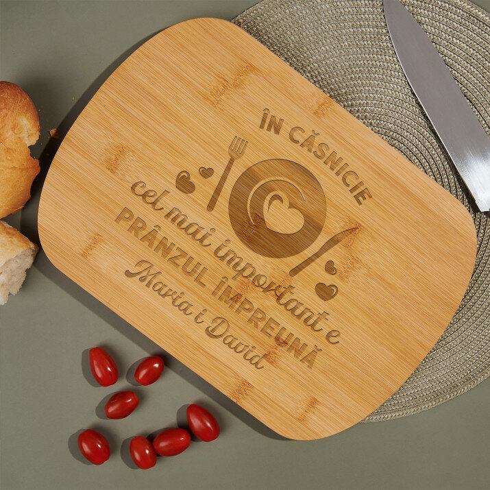Tocător Altom Design, confecționat din bambuc de de înaltă calitate va fi un instrument indispensabil la bucătărie. Dimensiunile sale practice, oferă un spațiu adecvat pentru a toca, tăia și servi o varietate de mâncăruri. Acest gadget de bucătărie nu numai că se remarcă prin aspectul său frumos, dar este, de asemenea, extrem de durabil și rezistent la zgârieturi . În plus, ascuțitoarea inclusă va permite menținerea cuțitelor în stare - perfect ascuțite, ceea ce se reflectă în precizie în timpul preparării bucatelor. Pe suprafața tocătorului, aplicăm un design personalizat ales de tine.