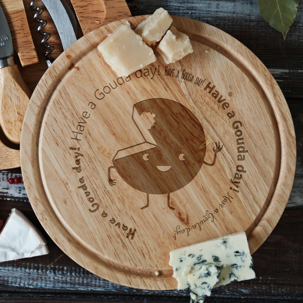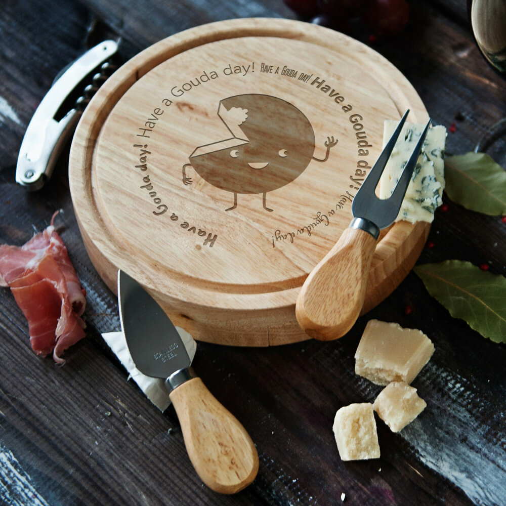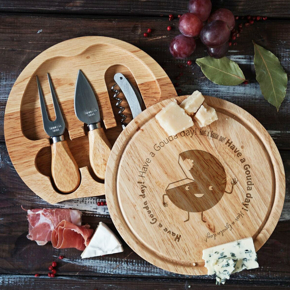 Realizat din lemn de calitate și rafinat tocător rotund pentru brânzeturi. Tocătorul servește în același timp drept cutie pentru setul de accesorii esențiale din oțel inoxidabil, astfel încât totul să fie mereu la un loc. Setul include :