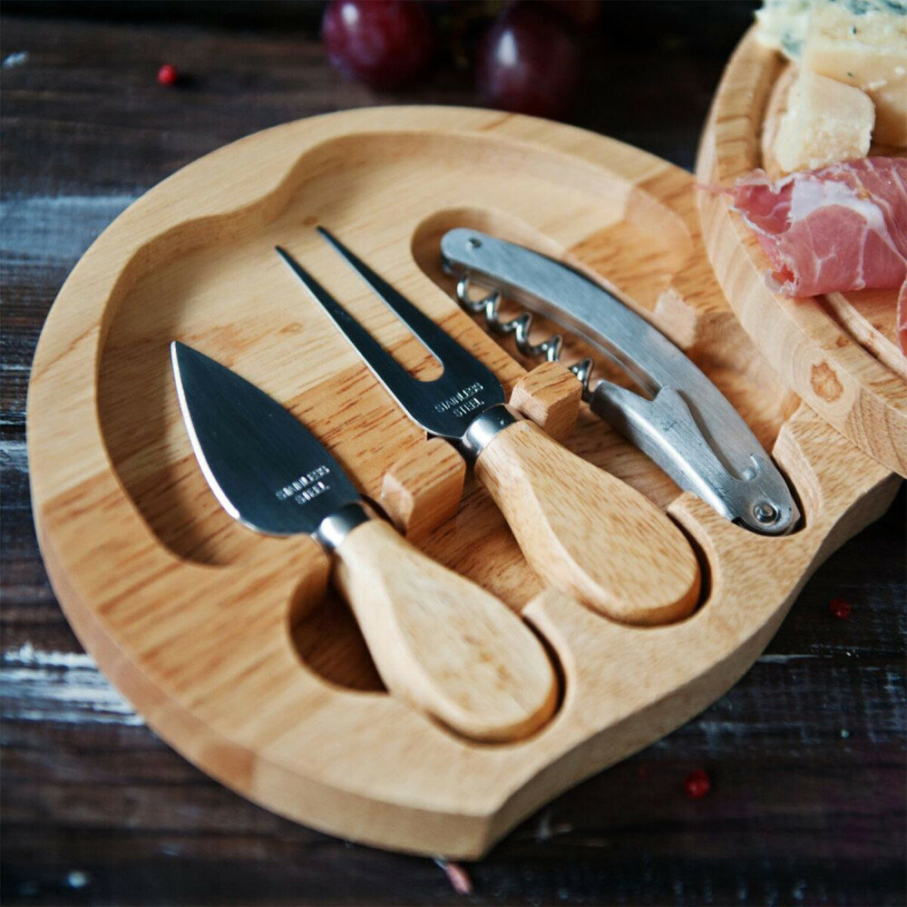 Realizat din lemn de calitate și rafinat tocător rotund pentru brânzeturi. Tocătorul servește în același timp drept cutie pentru setul de accesorii esențiale din oțel inoxidabil, astfel încât totul să fie mereu la un loc. Setul include :- Tocător din lemn (mărimea 18,5 x 3,6 cm),