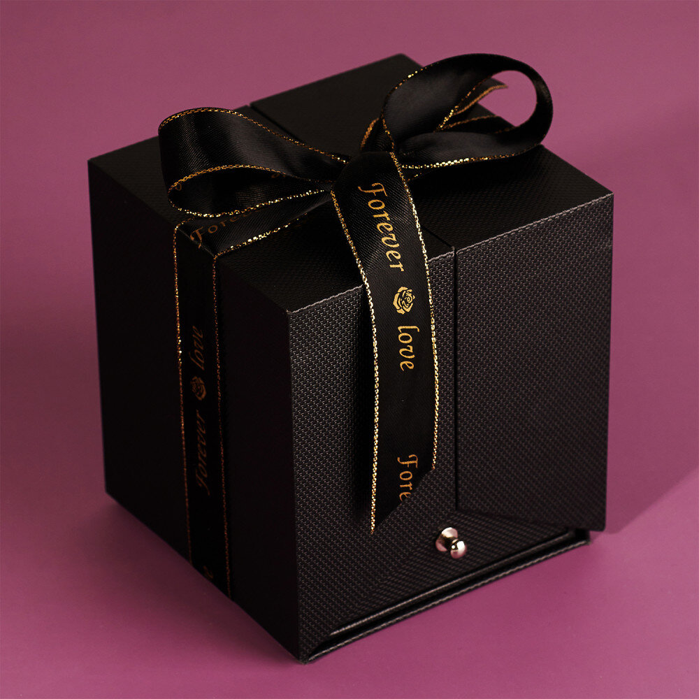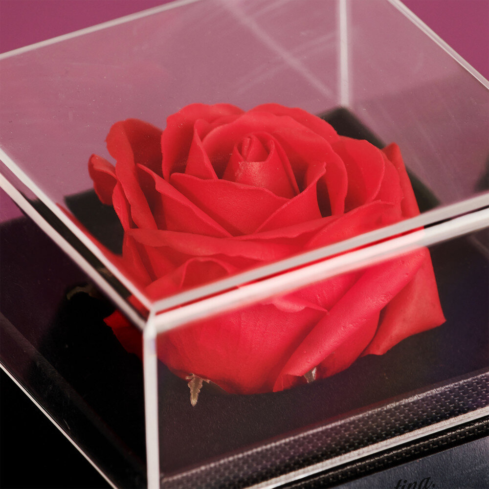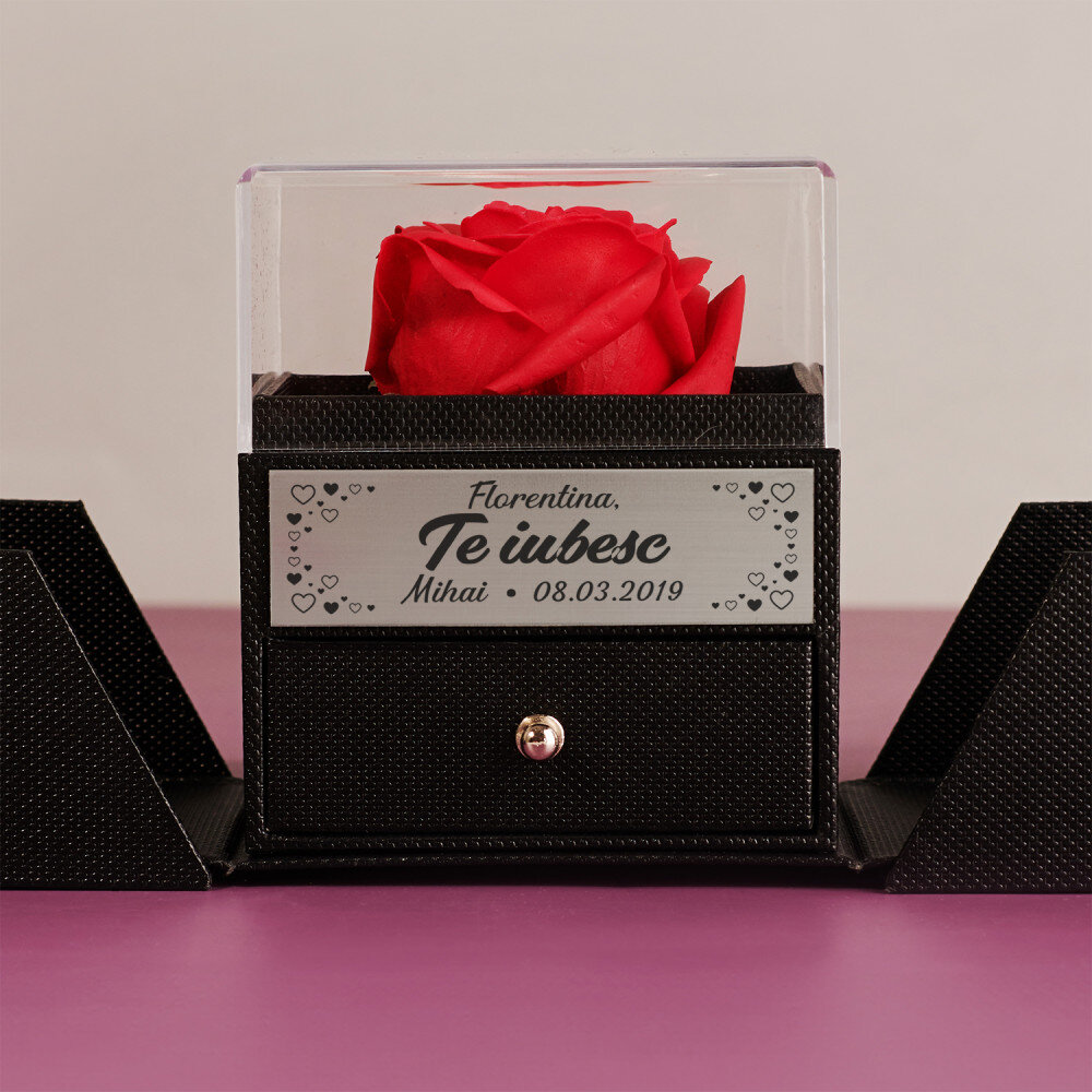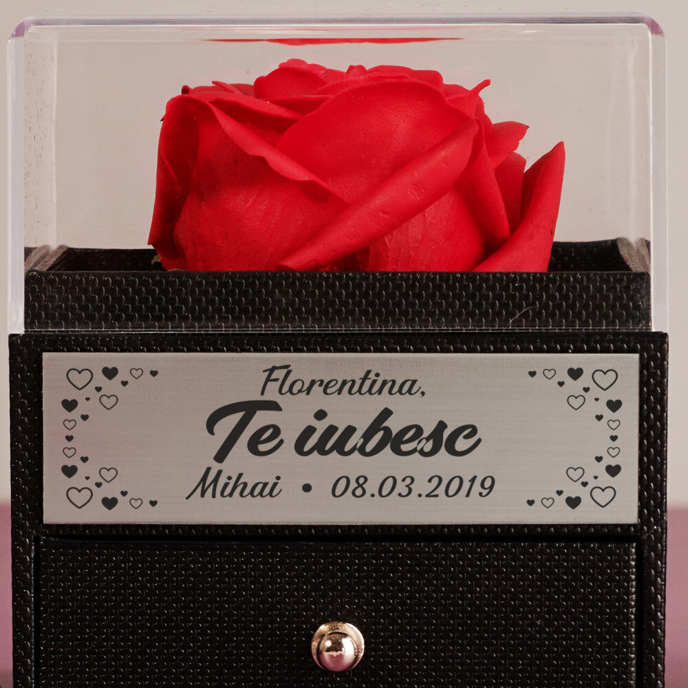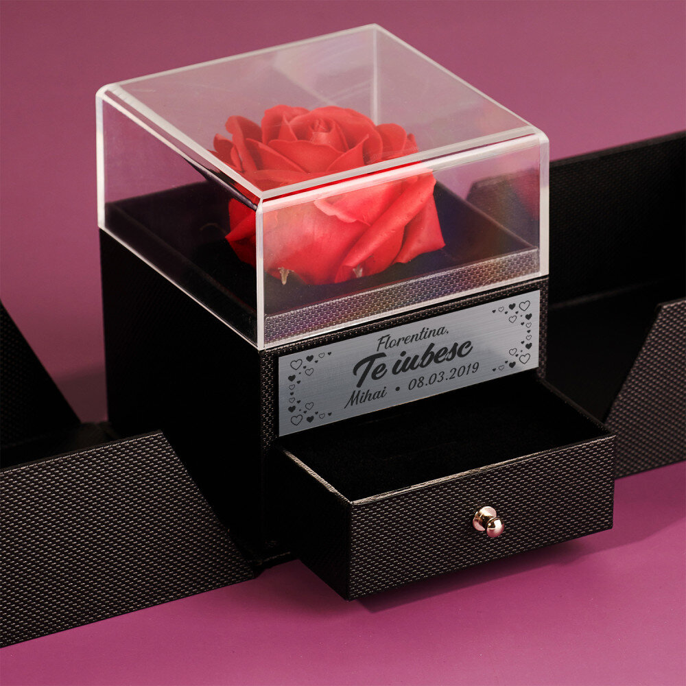 Un trandafir romantic etern într-o cutie de bijuterii este un cadou frumos care cu siguranță va aduce bucurie destinatarului prin ingeniozitatea sa! Datorită gravurii precise cu laser, poți personaliza cadoul și îl poți face unic. Întregul lucru arată ca un cadou fermecător datorită fundiței adăugate în partea de sus a ambalajului. Sertarul este conceput pentru a ține bijuterii sau alte bibelouri și este căptușit cu catifea moale în interior.
