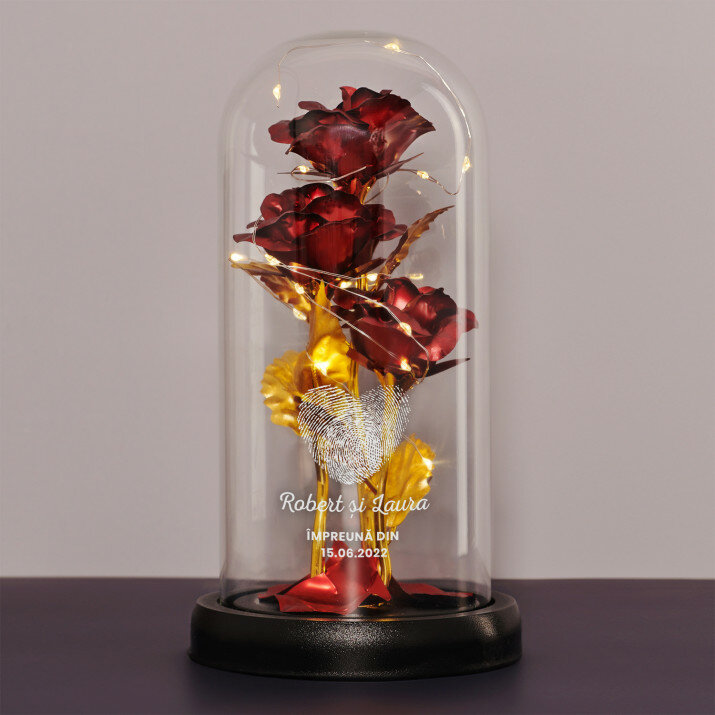 Trandafirul etern sub o cupolă de sticlă este un cadou deosebit, care poate fi dăruit la multe ocazii. Acesta este un cadou frumos și de neuitat, care va deveni o amintire frumoasă pentru ani la rând! Principala caracteristică a acestui produs este cupola sa rezistentă și transparentă, care protejează trandafirul delicat și îi conferă un aspect elegant. Suportul realizat din plastic de înaltă calitate asigură stabilitatea și durabilitatea întregii compoziții.În plus, luminițele LED plasate în interiorul trandafirului creează o atmosferă romantică. Pe suprafața cupolei de sticlă puteți adăuga inițialele gravate, un nume sau un mesaj scurt pentru a face acest cadou și mai special. Trandafirul etern este livrat într-o cutie de cadou.