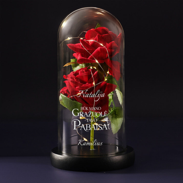 Trandafirul etern sub o cupolă de sticlă este un cadou deosebit, care poate fi dăruit la multe ocazii. Acesta este un cadou frumos și de neuitat, care va deveni o amintire frumoasă pentru ani la rând! Principala caracteristică a acestui produs este cupola sa rezistentă și transparentă, care protejează trandafirul delicat și îi conferă un aspect elegant. Suportul realizat din plastic de înaltă calitate asigură stabilitatea și durabilitatea întregii compoziții.În plus, luminițele LED plasate în interiorul trandafirului creează o atmosferă romantică. Pe suprafața cupolei de sticlă puteți adăuga inițialele gravate, un nume sau un mesaj scurt pentru a face acest cadou și mai special. Trandafirul etern este livrat într-o cutie de cadou.