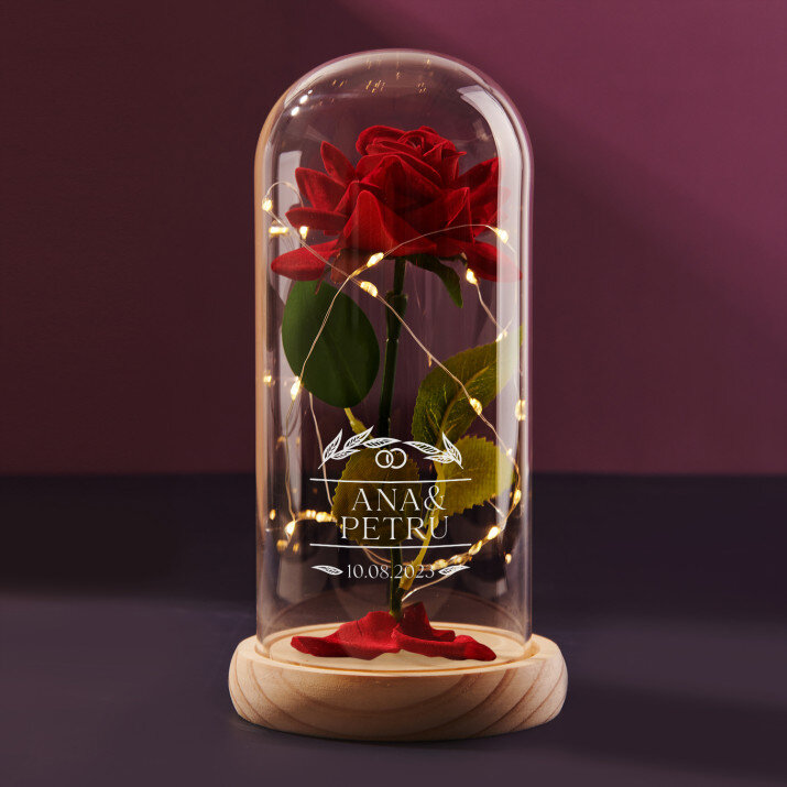 Trandafirul etern sub o cupolă de sticlă este un cadou deosebit, care poate fi dăruit la multe ocazii. Acesta este un cadou frumos și de neuitat, care va deveni o amintire frumoasă pentru ani la rând! Principala caracteristică a acestui produs este cupola sa rezistentă și transparentă, care protejează trandafirul delicat și îi conferă un aspect elegant. Suportul realizat din plastic de înaltă calitate asigură stabilitatea și durabilitatea întregii compoziții.În plus, luminițele LED plasate în interiorul trandafirului creează o atmosferă romantică. Pe suprafața cupolei de sticlă puteți adăuga inițialele gravate, un nume sau un mesaj scurt pentru a face acest cadou și mai special. Trandafirul etern este livrat într-o cutie de cadou.