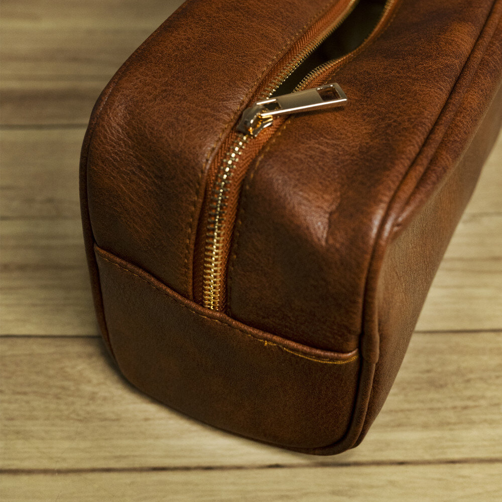 Trusa este confecționată dintr-un material asemănător cu pielea NuHide® PU. Culoarea maro. Finisajul de înaltă calitate asigură durabilitate, un aspect elegant și rezistență la murdărie. Interiorul trusei de toaletă este lavabil și este prevăzut cu o căptușeală din țesătură cu dungi. Totul este completat cu decorațiuni metalice. Trusa are, de asemenea, un buzunar ascuns. Acesta este un cadou foarte versatil, care va fi util pentru toată lumea!