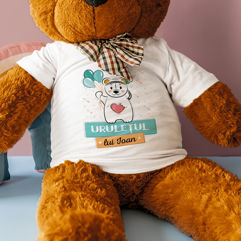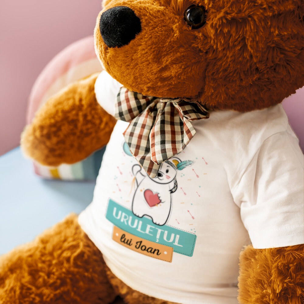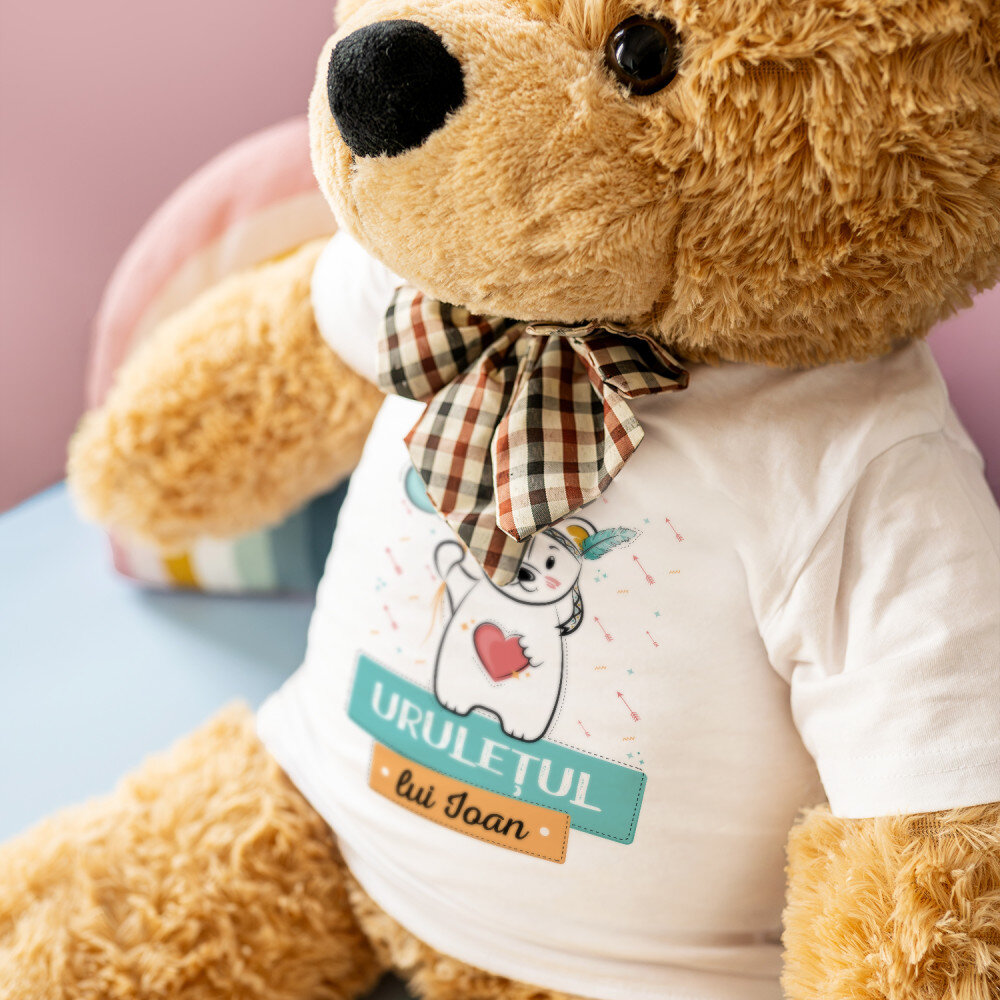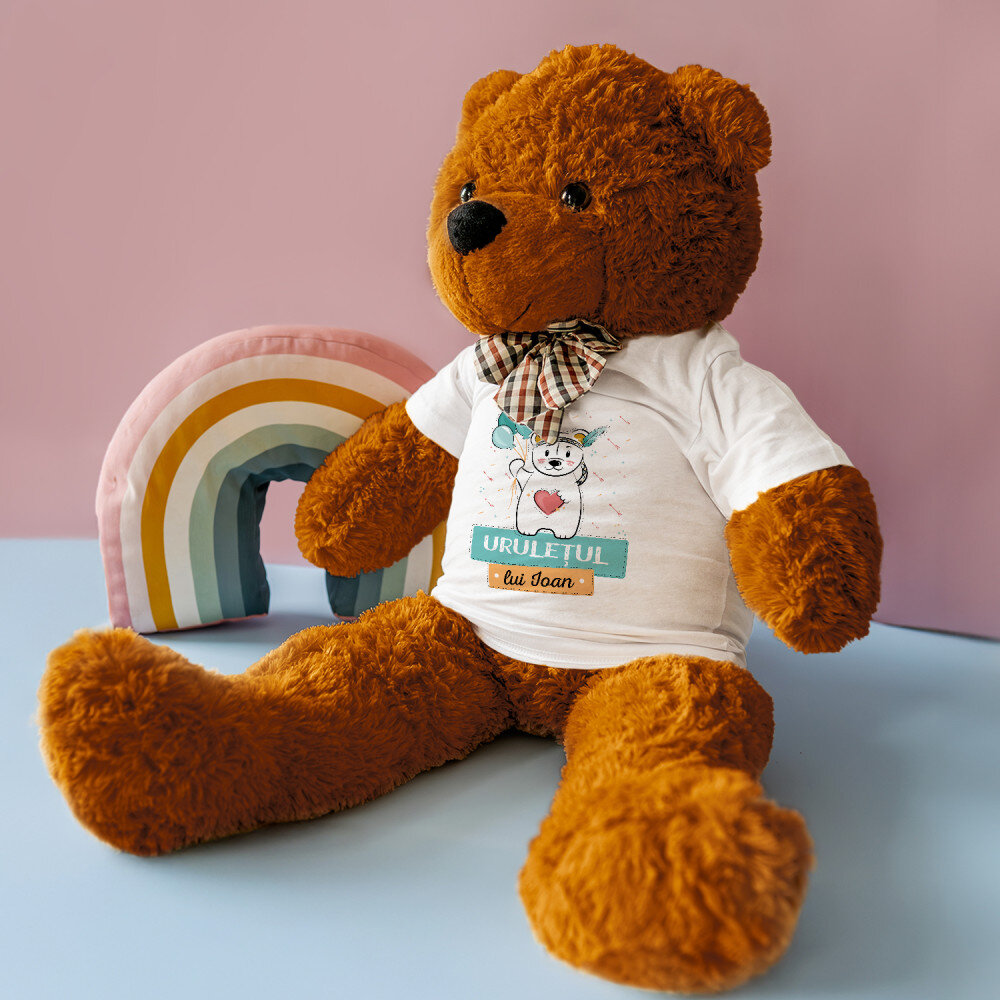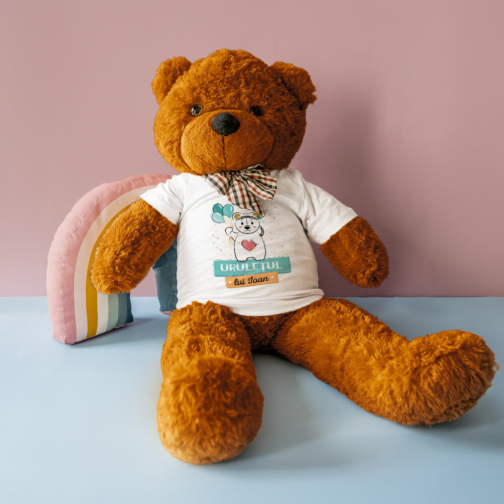 Ursuleț de pluș mare și extrem de simpatic, cu personalizare pe tricou. Este foarte moale la atingere, astfel încât cu siguranță va încânta destinatarul! Ursulețul de pluș are 90 cm înălțime și a fost realizat cu atenție la detalii, dându-i un aspect deosebit. Perfect ca un cadou pentru o persoană dragă.
