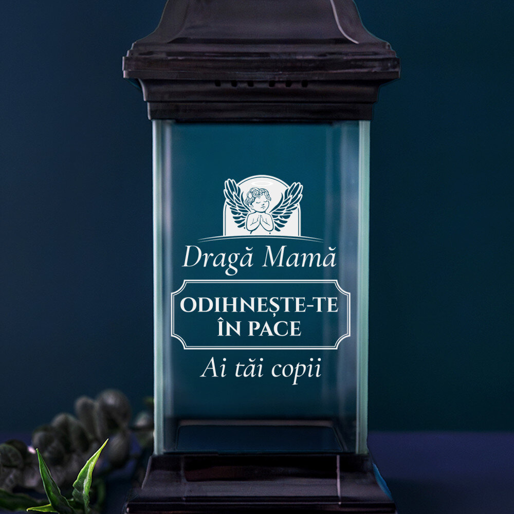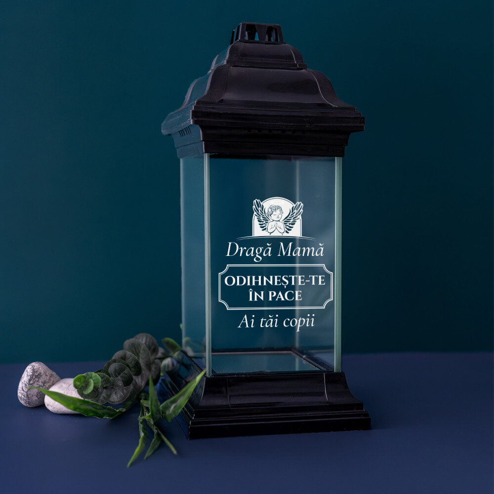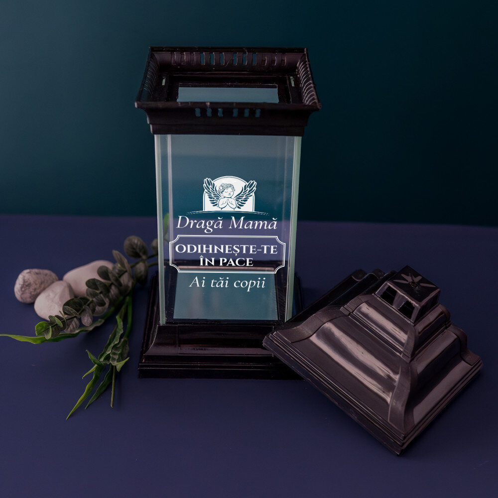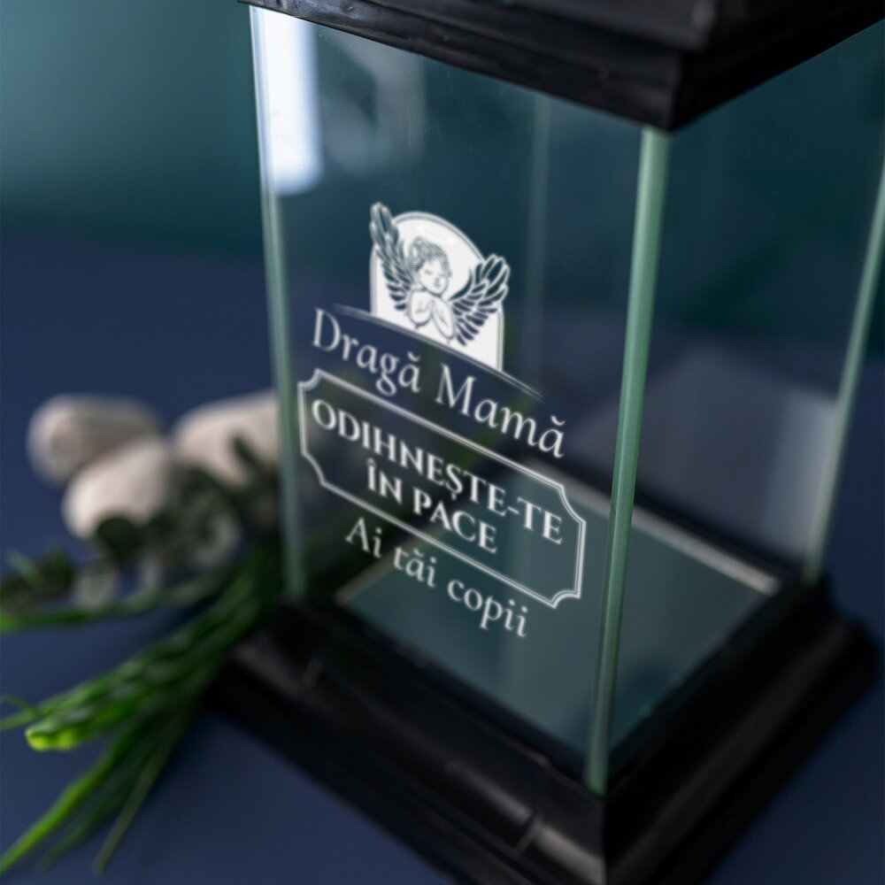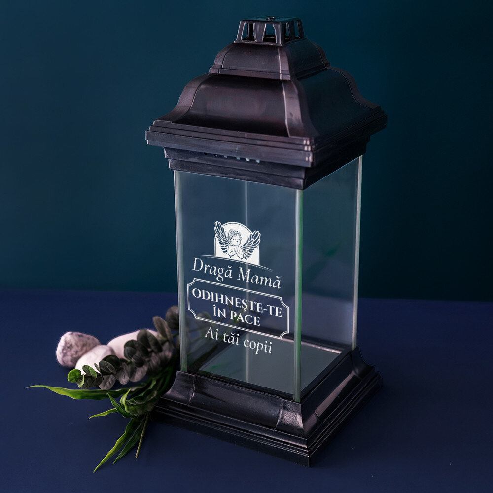 Candelă neagră elegantă cu inscripție personalizată. Sticla groasă o face grea și robustă. Baza asigură o stabilitate corespunzătoare. Lățimea deschiderii de 7,5 cm este potrivită pentru majoritatea reumpluturilor. Fundul candelei are un finisaj în oglindă, ceea ce o face deosebit de plăcută din punct de vedere estetic.