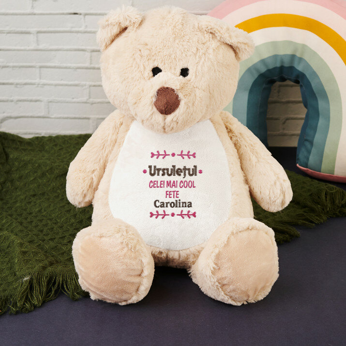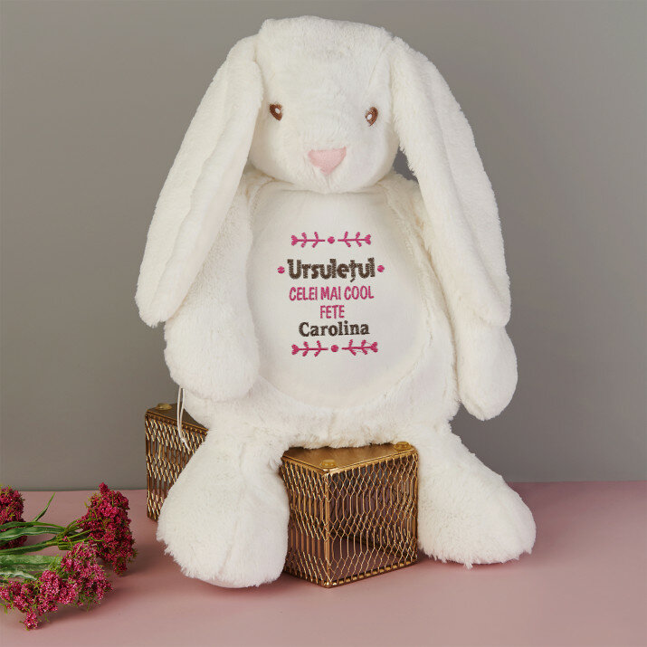 Un ursuleț sau iepuraș de pluș, mare și extrem de moale, decorat cu unul dintre modelele noastre personalizate, brodate. Jucărie de pluș, compoziție: 100% poliester. Mascota are un fermoar unic care permite ca interiorul să fie scos și curățat cu ușurință. Ursulețul de pluș este sigur pentru copii de toate vârstele. Se spală numai manual. Înălțimea ursulețului de pluș: 45 cm.