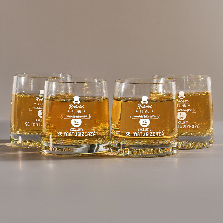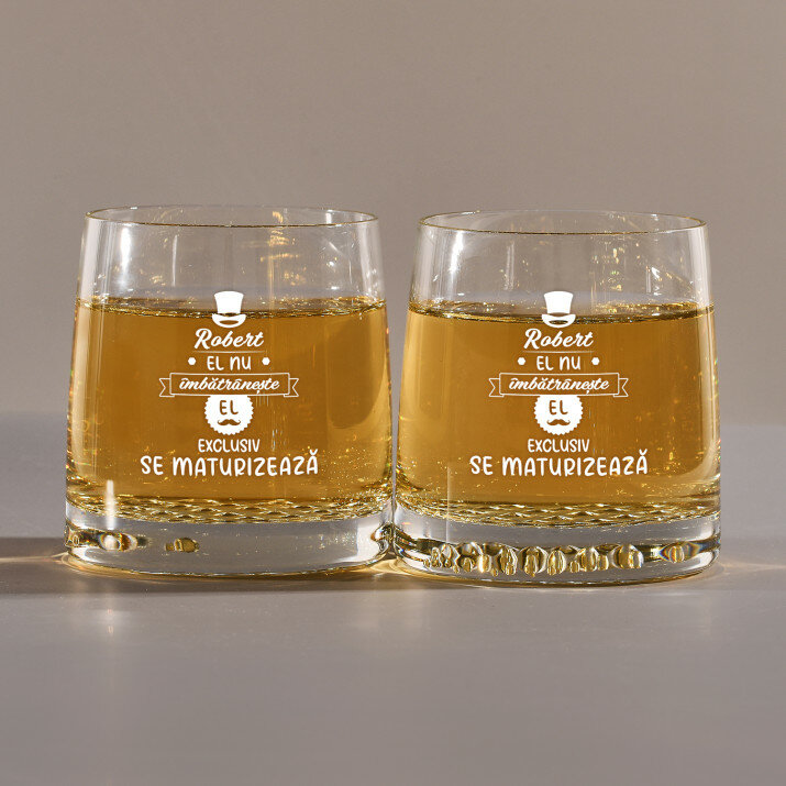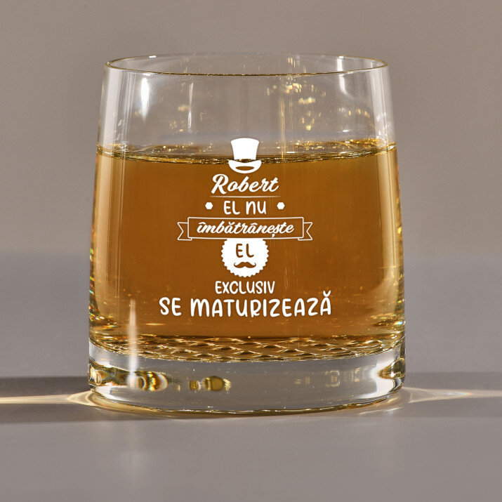 Acest pahar pentru whisky cu mesajul 'El nu îmbătrânește' este o lovitură de maestru. Un cadou minunat pentru iubitorii de whisky, iar mesajul îi conferă caracter.