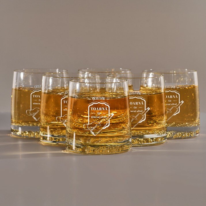 Paharele stilate de whisky sunt fabricate din sticlă transparentă cu adâncituri distinctive în partea de jos care se aseamănă cu cristalele de gheață. Designul minimalist și elegant face ca băutura ta preferată să fie prezentată frumos, în timp ce pereții netezi evidențiază în mod minunat gravura. Producătorul acestor pahare este compania poloneză KROSNO. Paharele pot fi spălate în mașina de spălat vase.Detalii: